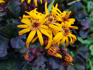 Ligularia dentata 'Midnight Lady' is a dramatic perennial featuring large, deep purple to almost black foliage that forms an architectural clump in shaded or partially shaded garden areas. Its tall spikes of bright yellow-orange flowers rise above the foliage, creating striking contrast and vertical interest in woodland borders and moisture-retentive beds. The blooms attract pollinators such as bees and butterflies, adding ecological value to shaded garden spaces.