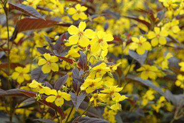 Lysimachia ciliata 'Firecracker' is a vibrant perennial with upright stems adorned with bright yellow flowers and striking bronze-red foliage, creating a bold and fiery display in garden borders or mixed plantings. The contrast between the colourful leaves and cheerful flowers adds both texture and visual interest. Its blooms attract pollinators, including bees and butterflies, enhancing the ecological value of the garden.