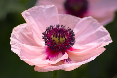 Papaver orientale ‘Karine’ is an elegant oriental poppy, admired for its large, soft pink blooms with a dark maroon central blotch that creates a striking contrast. The delicate colouring gives it a refined charm, making it an excellent choice for softening borders while still providing a bold focal point. The flowers are held high on strong, upright stems above a clump of coarse, hairy green foliage, bringing both structure and colour to summer planting schemes.