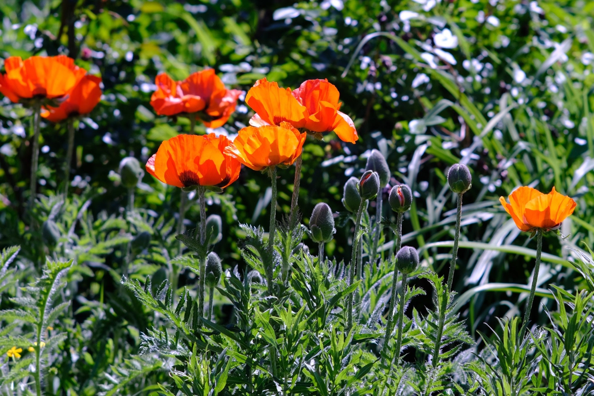 Papaver orientale ‘Prince of Orange’ is a striking oriental poppy, celebrated for its large, vibrant orange blooms with a contrasting dark central blotch. The ruffled, cup-shaped flowers are held on tall, sturdy stems above coarse, hairy green foliage, creating a bold and dramatic display in early summer borders. Its fiery colour and upright habit make it a standout focal point in cottage gardens, mixed perennial beds, and larger planting schemes.