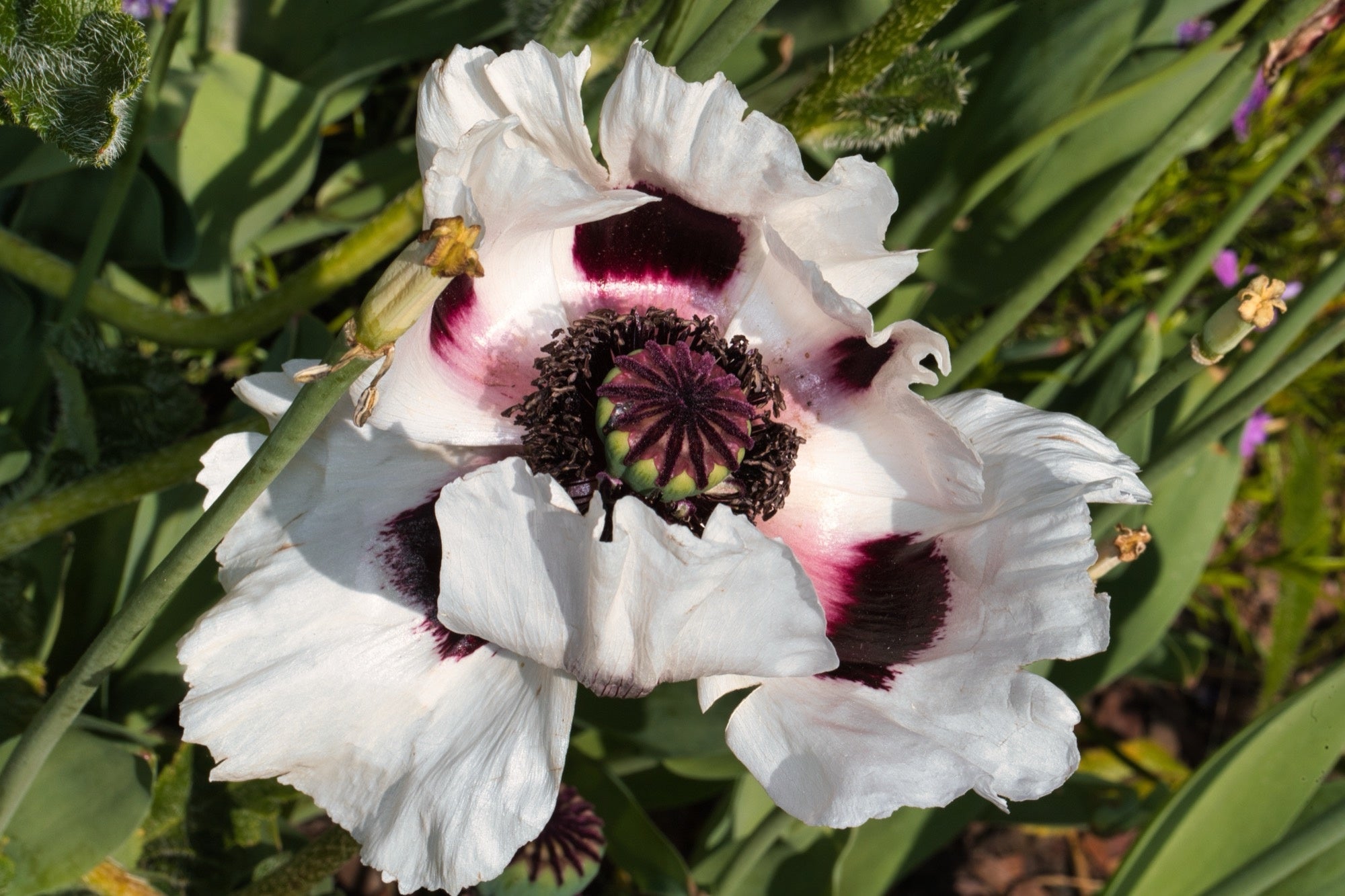 Papaver orientale ‘Royal Wedding’ is a stunning oriental poppy, celebrated for its large, pure white blooms with a contrasting dark central blotch. The ruffled, cup-shaped flowers rise on tall, sturdy stems above coarse, hairy green foliage, creating an elegant and eye-catching display in early summer borders. Its clean, bright colour adds a touch of refinement and contrast to cottage gardens, mixed perennial beds, and larger planting schemes.