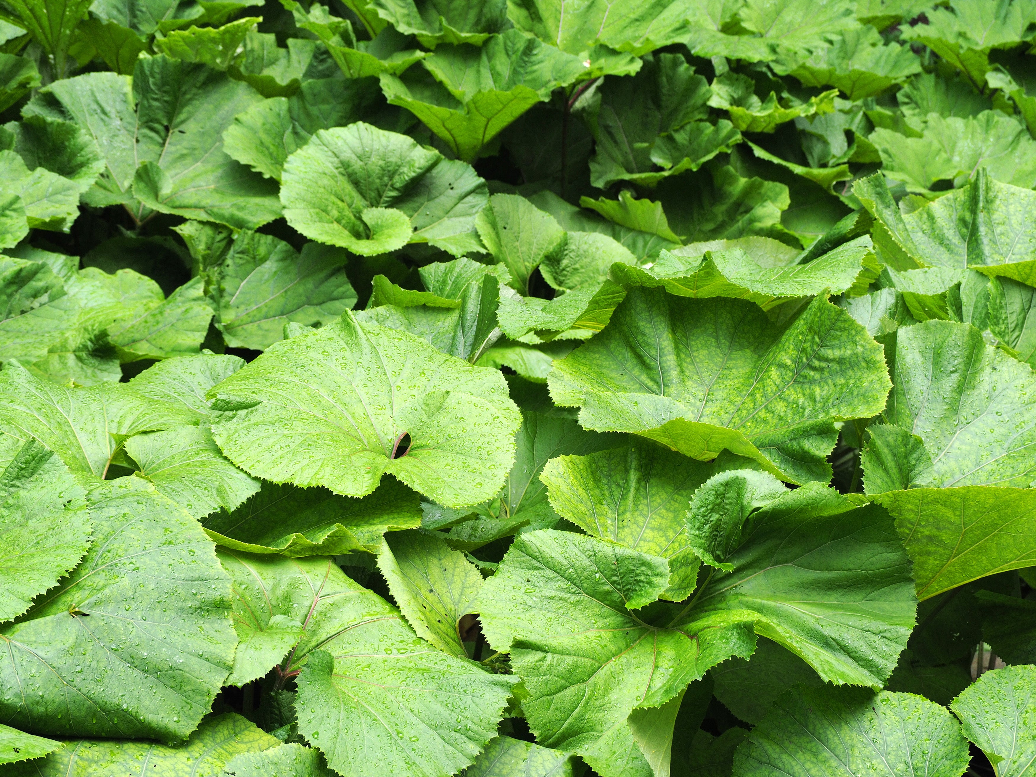 Petasites japonicus, commonly known as giant butterbur, is a striking perennial with massive, rounded leaves that form a bold, umbrella-like canopy over tall, fleshy stems. In early spring, it produces dense clusters of small, creamy-white flowers that rise just above the foliage, providing early-season interest before the leaves reach full size.