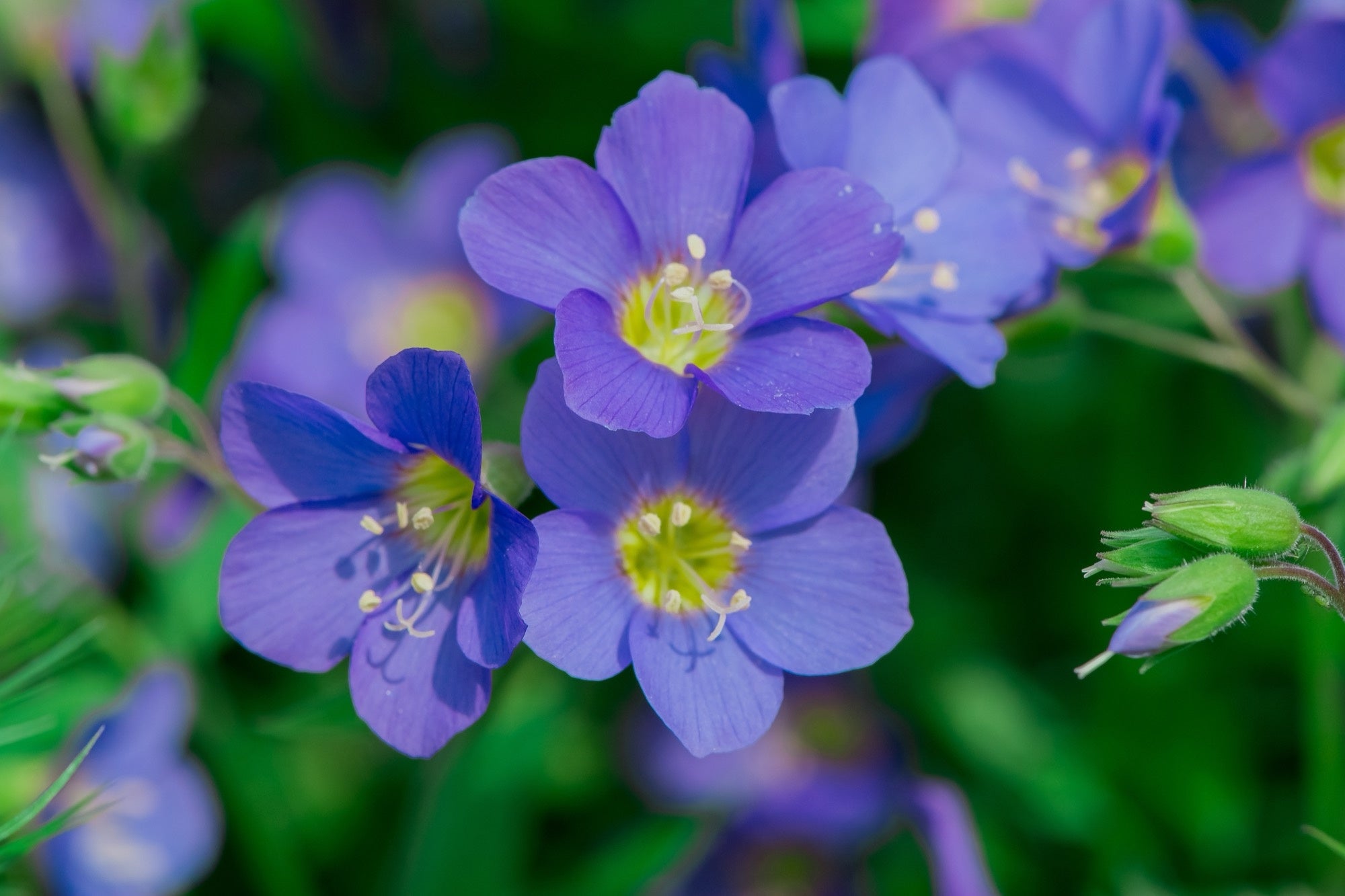 Polemonium 'Bressingham Purple', commonly known as Jacob's Ladder, is a compact perennial that adds a touch of elegance to any garden. This cultivar is celebrated for its deep purple, fern-like foliage that provides a striking backdrop to its clusters of bell-shaped, lavender-blue flowers. The blooms, adorned with bright yellow stamens, appear in mid to late spring, creating a captivating display atop burgundy stems. The plant's unique foliage, which becomes more vibrant in cooler temperatures, adds year-round interest to the garden.