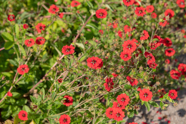 Potentilla ‘Gibson’s Scarlet’ is a vibrant clump-forming perennial that bursts into life in summer with clusters of single scarlet-red, saucer-shaped flowers held above palmate, strawberry-like foliage. The flowers have contrasting dark centres and appear continuously from early summer through to late summer, providing long-lasting colour in sunny borders, cottage garden beds or along pathways. The foliage remains tidy, mid-green, serving as an excellent foil for the vivid blooms. Deadheading spent flowers encourages more blooms and keeps the plant looking its best.