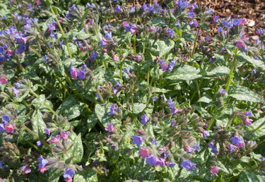Pulmonaria 'Trevi Fountain' is a clump-forming perennial producing soft blue, funnel-shaped flowers in early spring above a rosette of fresh green foliage adorned with striking silver markings. The flowers provide early-season colour and texture in borders, rockeries, or shaded containers. Its low, compact habit makes it ideal for underplanting shrubs or planting along shaded pathways. This cultivar attracts early-season pollinators, offering both ecological and ornamental value while enhancing the visual appeal of spring gardens.
