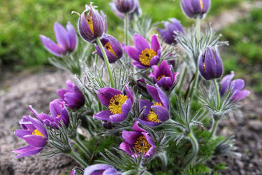 Pulsatilla vulgaris, commonly known as the pasqueflower, is a charming perennial producing large, nodding, deep violet-purple, cup-shaped flowers in early spring above finely dissected, fern-like green foliage. The striking flowers provide early-season colour and a delicate texture in borders, rockeries, or wildflower gardens. Its upright, clump-forming habit makes it suitable for naturalistic plantings and attracts early pollinators such as bees, enhancing the ecological value of the garden.