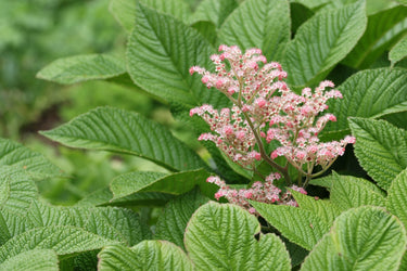 Rodgersia aesculifolia is a robust perennial with large, palmate, bronze-green leaves that create dramatic architectural interest in borders, woodland gardens, or near water features. In summer, it produces tall, erect panicles of creamy-white flowers, adding height and a striking textural contrast. The lush foliage and flower spikes provide both ornamental appeal and ecological value, attracting pollinators such as bees and butterflies to the garden.