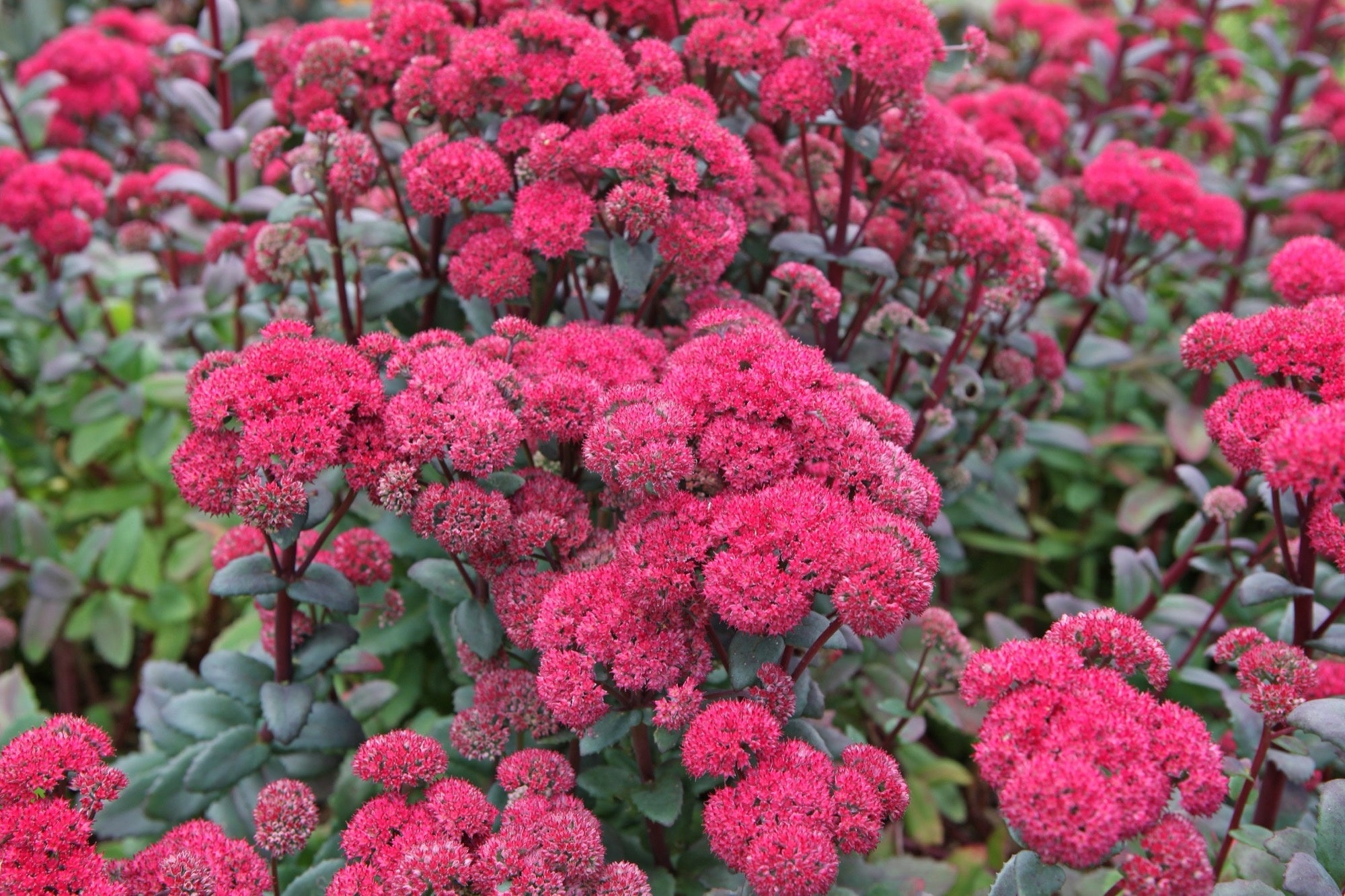 Sedum 'Red Cauli', also known as Hylotelephium 'Red Cauli', is a clump-forming perennial appreciated for its fleshy, blue-green foliage and clusters of vibrant red star-shaped flowers that bloom from late summer into early autumn. The upright stems rise above the compact foliage, creating a bold, textured display that adds striking colour and structure to borders, gravel gardens, and container plantings. Its long-lasting flowers gradually deepen in intensity, providing extended seasonal interest and visual appeal.