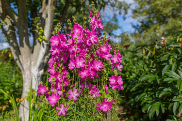 Sidalcea 'Partygirl' is a clump-forming perennial valued for its vibrant green foliage and spikes of bright pink cup-shaped flowers that bloom from mid to late summer. The upright stems rise above the foliage, creating a lively and textured display that adds colour and charm to borders, cottage gardens, and naturalised plantings. The long-lasting blooms attract pollinators and provide extended seasonal interest.