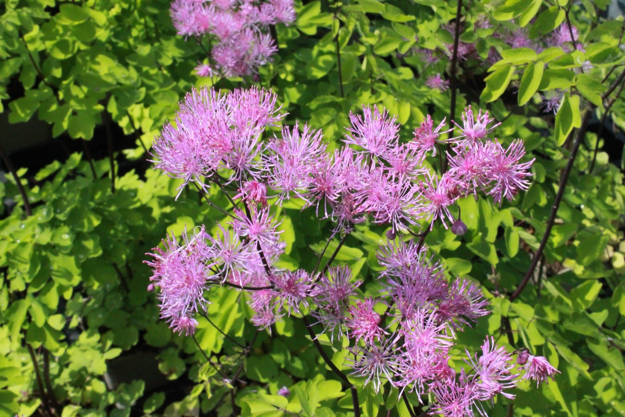 Thalictrum 'Black Stockings' is an elegant, clump-forming perennial featuring finely divided, fern-like foliage and airy panicles of rich, dark purple flowers that bloom from early to mid-summer. The tall, graceful stems provide vertical structure and movement, adding drama and sophistication to borders, cottage gardens, and naturalistic plantings. Its nectar-rich flowers attract bees, butterflies, and other pollinators, providing both ornamental and ecological value.